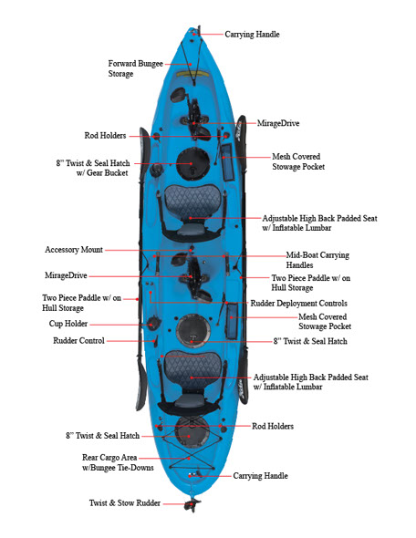 Smooth, stable and built for two, the Outfitter is designed around a philosophy of utility, performance and ease-of-use. Onboard, little features such as molded utility trays, built-in drink holders, dual helm controls, or conveniently positioned rod holders make the Outfitter a pleasure to use, regardless of the destination. Whether it’s a solo after-work session or a long weekend of float casting with a friend, the Outfitter boasts a wide, stable hull platform, dual MirageDrives® and ample stowage space to keep you well provisioned and properly organized.
